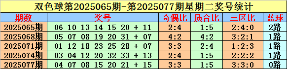 双色球在第2025065期-第2025077期周二开奖中,红球奇偶比累计为14:16,基本捏平;红球质合比累计为9:21,与表面比基本罕见;红球三区比累计为11:13:6,红三区开出比例较低。