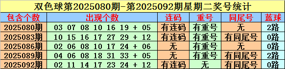 双色球在第2025080期-第2025092期周二开奖中,连码组合出现了3期,开出比例相对较低;重号出现了4期,施展相对较热;同尾号码出现了3次,走势相对较冷。
